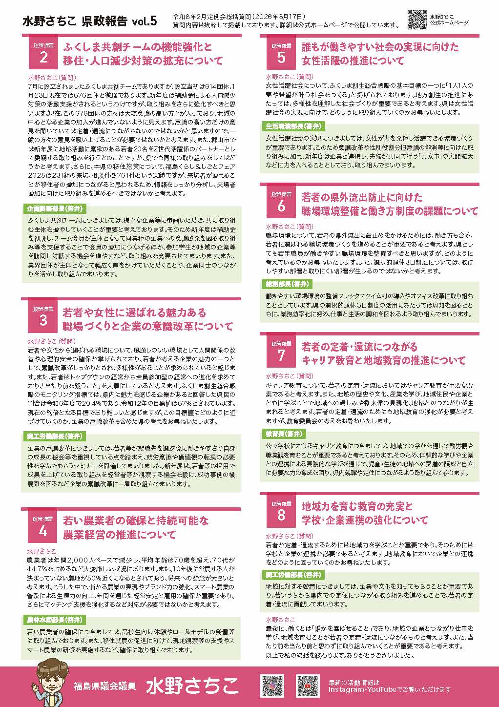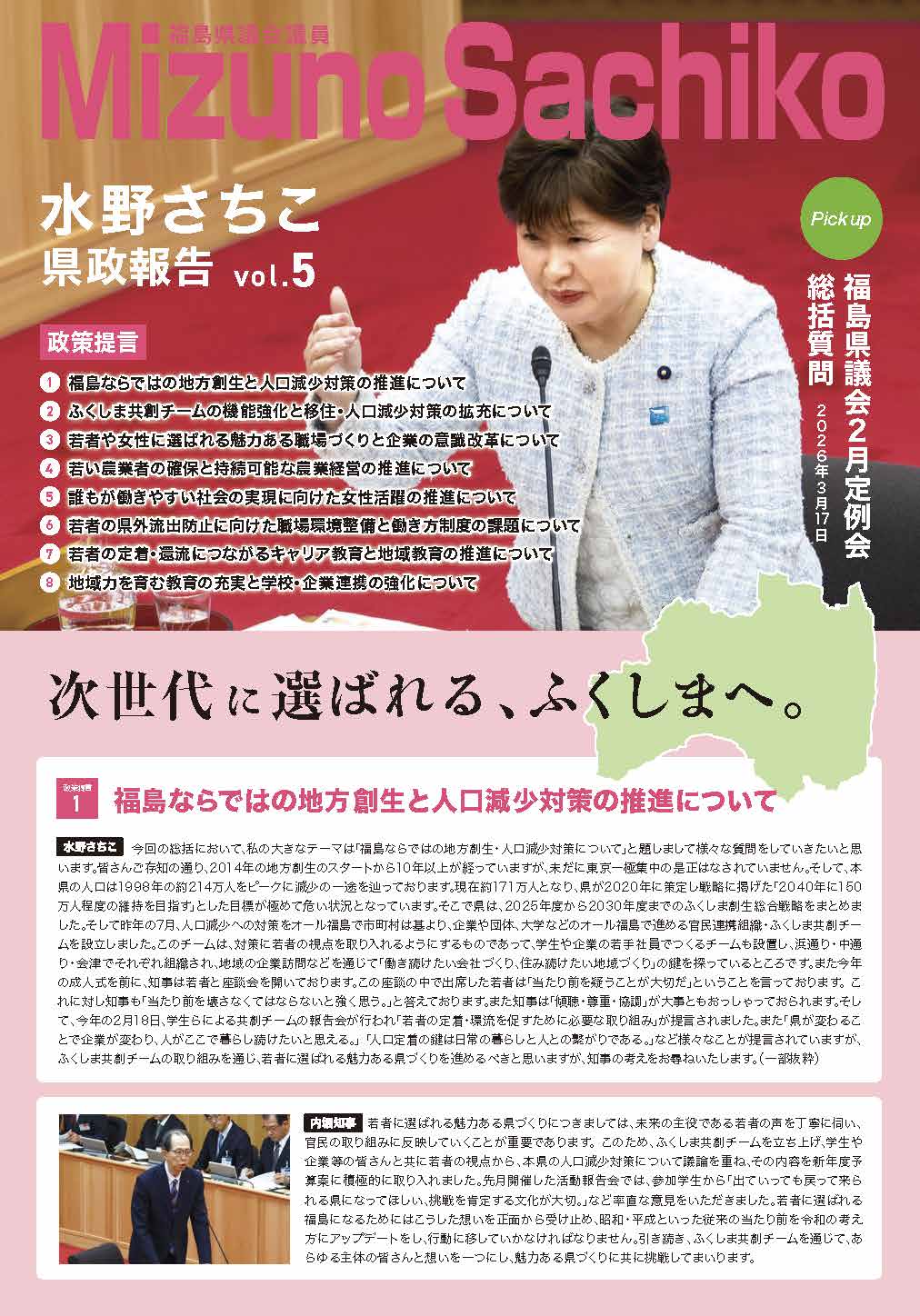 無所属の水野さち子です。今回の定例会は地方創生・人口減少対策、また福島共創チームとたくさんの質疑が出ておりが、 今回の総括において、私の大きなテーマは「福島ならではの地方創生・人口減少対策について」と題しまして様々な質問をしていきたいと思います。 皆さんご存知の通り、2014年の地方創生のスタートから10 年以上が経っていますが、未だに東京一極集中の是正はなされていません。そして本県の人口は1998年の約 214万人をピークに減少の一途を辿っております。現在約171万人となり、県が2020年に策定し戦略に掲げた「2040年に150万人程度の維持を目指す」とした目標が極めて危い状況となっています。そこで県は2025 年度から2030年度までのふくしま創生総合戦略をまとめました。そして昨年の7 月、人口減少への対策をオール福島で市町村は基より、企業や団体、大学などのオール福島で進める官民連携組織・ふくしま共創チームを設立しました。このチームは、対策に若者の視点を取り入れるようにするものであって 、学生や企業の若手社員でつくるチームも設置し、浜通り・中通り・会津でそれぞれ組織され、地域の企業訪問などを通じて、「働き続けたい会社づくり、住み続けたい地域づくり」の鍵を探っ ているところです。 また今年の成人式を前に、知事は若者と座談会を開いております。この座談の中で出席した若者は「当たり前を疑うことが大切だ」ということを言っております。そして、これに対し知事も答えております。「当たり前を壊さなくてはならないと強く思う。」と、例として知事が企画調整部長の頃は、「施策を議論する審議会に女性の委員があまりおらず、それが当たり前になっていた」とおっしゃっています。ですから、これを壊すことによって男性と女性の委員のバランスを取ったそうです。また知事は「傾聴・尊重・協調」が大事ともおっしゃっておられます。そして、今年の2月18日、学生らによる共創チームの報告会が行われました。この定例会で、浜通りは福島高専、中通りは福島大学、会津は会津大学の学生が「若者の定着環流を促すために必要な取り組み」を提言しています。会津大学の学生の方々がまとめた中の一文が刺激的だったのでご紹介します。「福島県庁の方へ、県が変わることで企業が変わり、人がここで暮らし続けたいと思える。」と言っております。私たちも「当たり前を疑って変えていかなければならない!」ということを強く認識させられました。また、他にも「人口定着の鍵は日常の暮らしと人との繋がりである。」など、様々なことを提言していますが、ふくしま共創チームの取り組みを通じ、若者に選ばれる魅力ある県づくりを進めるべきと思いますが、知事の考えをお尋ねいたします。